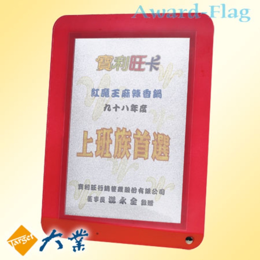 材質:壓克力造型獎座採用壓克力、水晶、琉璃、木材、金屬…..等,運用雷射、轉印、UV彩印、專業輸出…等科技與技術,配合美編及影像結合的創意客製化獎品與個性化的禮品之創意商品。適合榮耀獎牌或文鎮擺飾及一般公司團體的禮贈品或親朋好友長官同事陞遷、喬遷、開業、生日節日喜慶禮物。